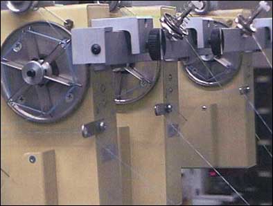 This system is manufactured by MEMMINGER. It is a electronic servo type storage feeder. This tension control system pulls the yarn from the cone and feeds it to the knitting machine feed system at a constant and even tension.